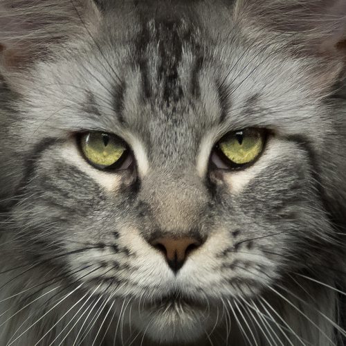 Son faciès singulier au regard puissant lui donne un air sérieux, ce qui contraste avec le fait que les Maine Coon ont le « cœur sur la patte » !